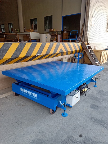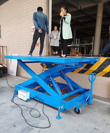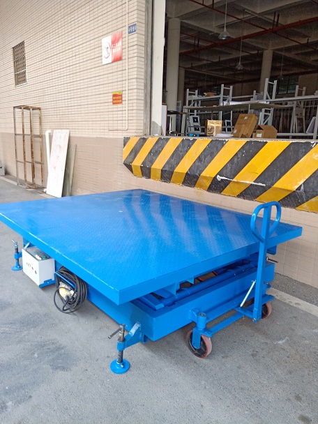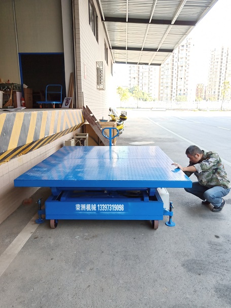 此款升降平臺帶車輪,移動方便,可以在不同的地方使用,又帶支撐腿,承重的時候不會移動,負載大,使用安全。